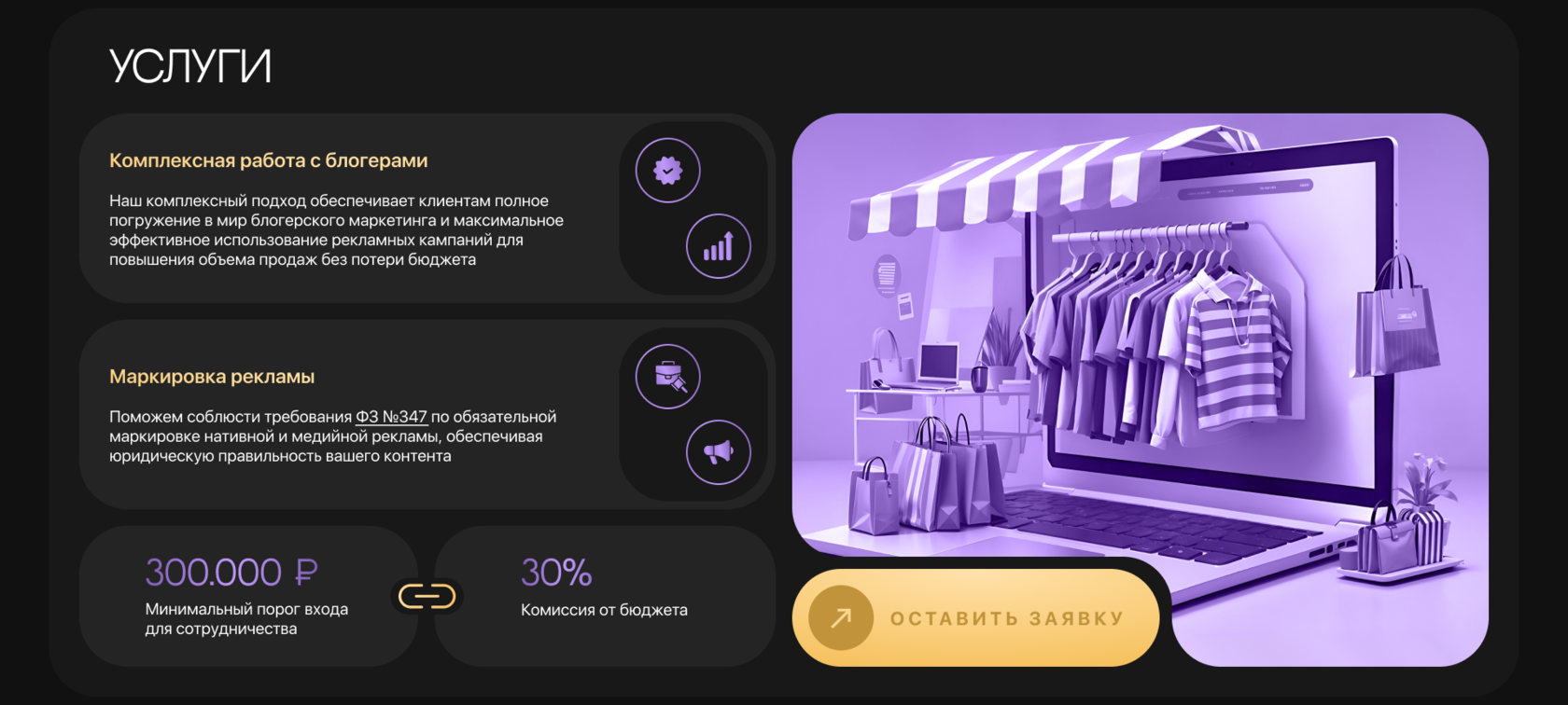 Наш комплексный подход обеспечивает клиентам полное погружение в мир блогерского маркетинга и максимальное эффективное использование рекламных кампаний для повышения объема продаж без потери бюджета